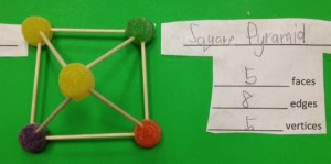 While all solid figures do not have edges, faces, and vertices (think about a sphere), many solid figures do and students remember the ones that don’t because they didn’t get to use gumdrops for those shapes.