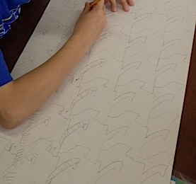 Step 3: Trace the tessellation pattern repeatedly on a piece of paper. It can be translated, rotated, or reflected depending upon what the kiddo wants and the type of pattern that was developed.